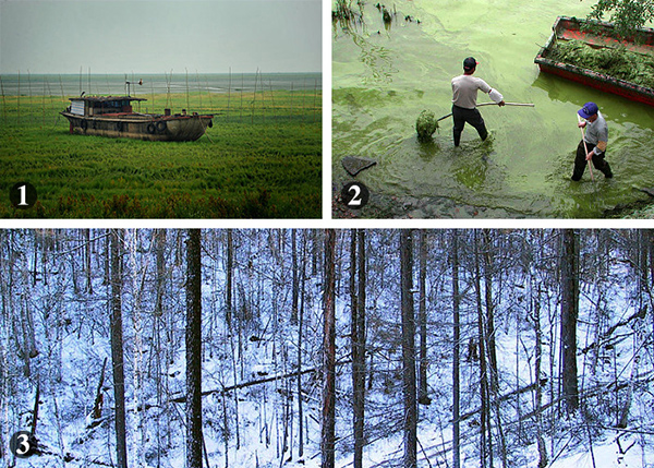 1:2011年,江西省新建縣南磯鄉(xiāng),一艘大漁船擱淺在鄱陽湖湖底草坪上。2:2001年,工作人員在江蘇無錫黿頭渚景區(qū)“圍剿”太湖藍藻。3:2002年,采伐后大興安嶺稀疏的森林。