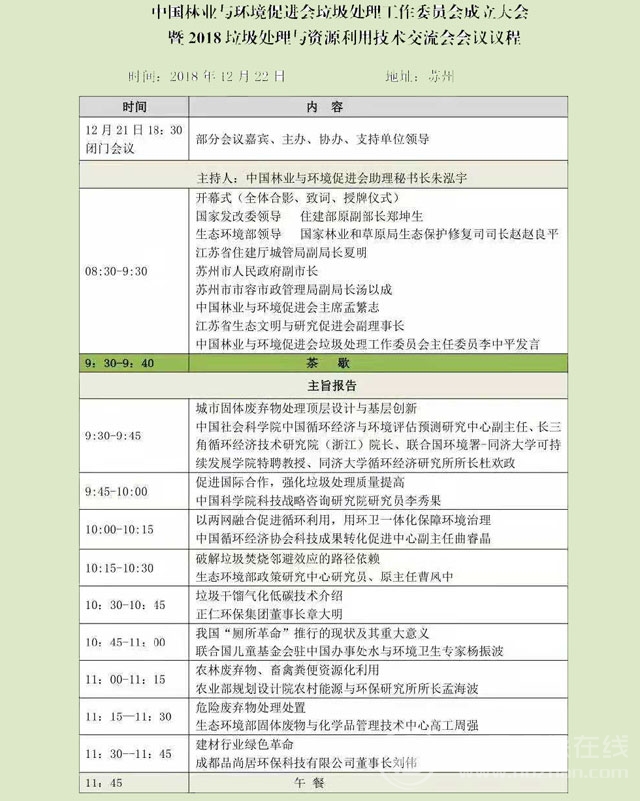根據(jù)擬定的會議議程表,將于12月22日08:30舉行會議開幕式。期間,住建部原副部長鄭坤生、國家林業(yè)和草原局生態(tài)保護修復司司長趙良平、江蘇省住建廳城管局副局長夏明、蘇州市人民政府副市長、蘇州市市容市政管理局副局長湯以成、中國林業(yè)與環(huán)境促進會主席孟繁志、江蘇省生態(tài)文明與研究促進會副理事長、中國林業(yè)與環(huán)境促進會垃圾處理工作委員會主任委員李中平帶來精彩發(fā)言。