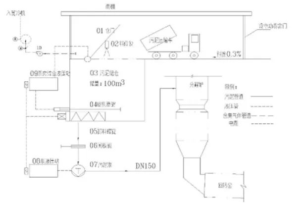 整個(gè)污泥輸送系統(tǒng)由污泥儲(chǔ)存系統(tǒng)、泵送系統(tǒng)及PLC自動(dòng)控制系統(tǒng)組成。工藝流程詳見(jiàn)下圖。