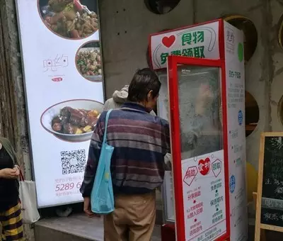 一個(gè)媽媽帶著放學(xué)的孩子經(jīng)過分享冰箱,
