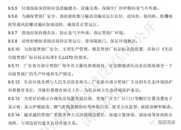 9.5.9 焚燒廠廠區(qū)環(huán)境和廠內(nèi)設備應保持清潔、整齊。 9.5.10 焚燒廠應按照《生活垃圾焚燒廠標識標志標準》CJJ270 設置廠內(nèi)標識標志。