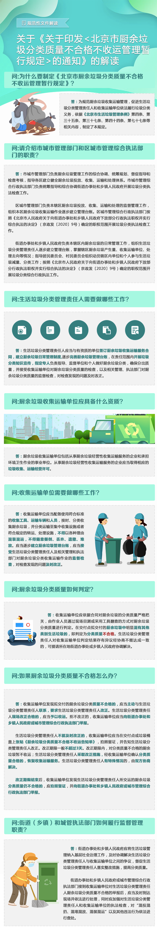 區(qū)城市管理部門負(fù)責(zé)本轄區(qū)廚余垃圾投放、收集、運(yùn)輸和處理的監(jiān)督管理工作,組織本區(qū)廚余垃圾收集運(yùn)輸作業(yè)單位建立管理臺(tái)賬。區(qū)城市管理綜合行政執(zhí)法部門按照《北京市人民政府關(guān)于向街道辦事處和鄉(xiāng)鎮(zhèn)人民政府下放部分行政執(zhí)法職權(quán)并實(shí)行綜合執(zhí)法的決定》(京政發(fā)〔2020〕9號(hào))確定的職權(quán)范圍開(kāi)展垃圾分類執(zhí)法檢查工作。