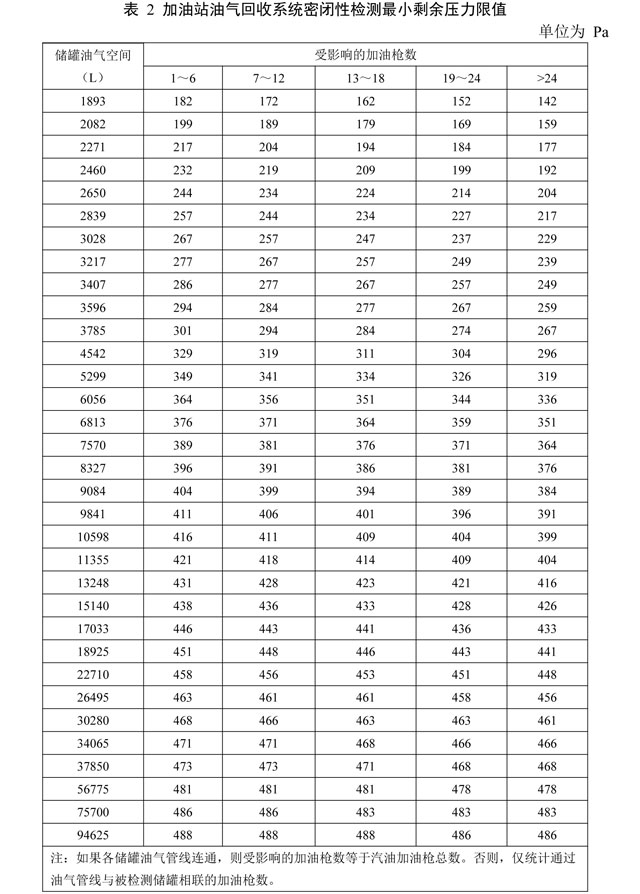 密閉性限值執(zhí)行GB20952標準規(guī)定,油氣回收系統(tǒng)密閉性壓力檢測值應大于等于表2規(guī)定的最小剩余壓力限值。