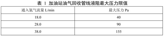 液阻限值執(zhí)行GB20952標準規(guī)定,加油油氣回收管線液阻檢測值應小于表1規(guī)定的最大壓力限值。