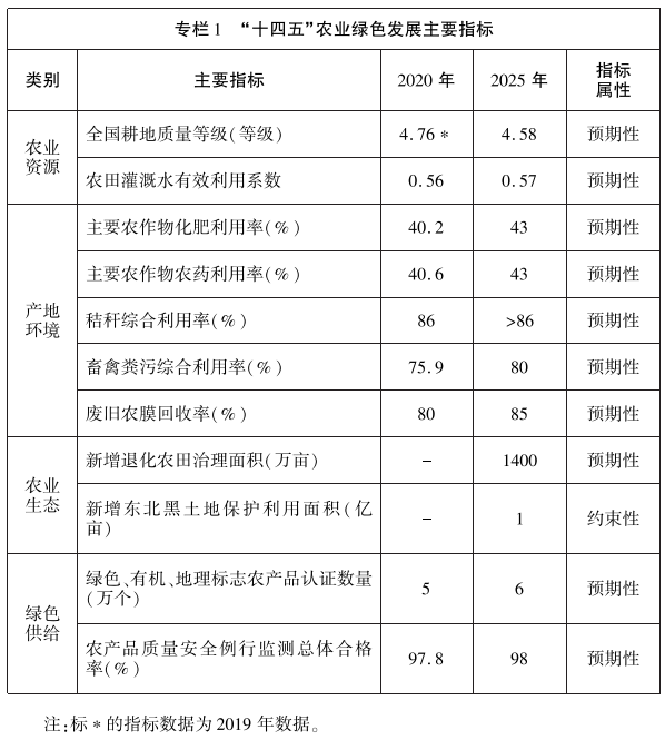 到2025年,農(nóng)業(yè)綠色發(fā)展全面推進(jìn),制度體系和工作機(jī)制基本健全,科技支撐和政策保障更加有力,農(nóng)村生產(chǎn)生活方式綠色轉(zhuǎn)型取得明顯進(jìn)展——資源利用水平明顯提高、產(chǎn)地環(huán)境質(zhì)量明顯好轉(zhuǎn)、農(nóng)業(yè)生態(tài)系統(tǒng)明顯改善、綠色產(chǎn)品供給明顯增加、減排固碳能力明顯增強(qiáng)。