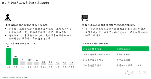 在危廢產(chǎn)量高的省份,頭部企業(yè)更是具有絕對優(yōu)勢,例如光大綠色環(huán)保,一方面重點關注危廢產(chǎn)生量高度集中的區(qū)域,早早布局江蘇、山東兩個產(chǎn)廢大省和貯存大省,將其60%的產(chǎn)能都布局于此,兩省累計布局超過110萬噸的產(chǎn)能,以此為基礎,在江蘇、山東產(chǎn)能逐漸過剩時,其最新的項目開始以江蘇為中心向東南各省擴展;另一方面,他們也特別關注危廢產(chǎn)量高省份在工業(yè)園區(qū)及周邊布局危廢處理設施,擁有多個危廢項目布局在工業(yè)園區(qū)及周邊,保障危廢來源,避免了中小產(chǎn)廢企業(yè)遷移或關停造成拿料困難的情況(見圖2)。