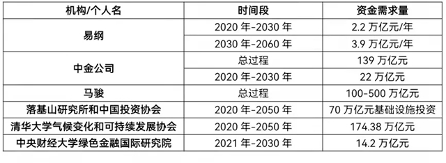 我國(guó)制定2030年前碳排放達(dá)峰行動(dòng)方案,重點(diǎn)在于優(yōu)化產(chǎn)業(yè)結(jié)構(gòu)和能源結(jié)構(gòu),實(shí)施金融支持綠色低碳發(fā)展專(zhuān)項(xiàng)政策,設(shè)立碳減排支持工具。目前,我國(guó)重點(diǎn)用能行業(yè)綠色低碳轉(zhuǎn)型地資金需求規(guī)模大依然較大,國(guó)內(nèi)多家機(jī)構(gòu)及領(lǐng)導(dǎo)、專(zhuān)家對(duì)于實(shí)現(xiàn)雙碳目標(biāo)期間的投資需求資金量也做出相關(guān)預(yù)測(cè):