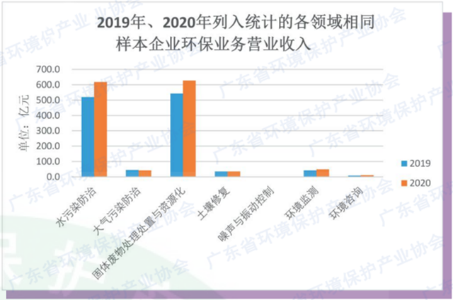 產(chǎn)業(yè)增長情況方面,2020年,統(tǒng)計范圍內(nèi)共有1153家企業(yè)同為2019年我省環(huán)保產(chǎn)業(yè)發(fā)展狀況的綜合量化分析樣本。在各細分領域企業(yè)的營業(yè)收入方面,與2019年相比,除土壤修復、環(huán)境監(jiān)測同比下降外,水污染防治、大氣污染防治、固體廢物處理處置與資源化、噪聲與振動控制、環(huán)境咨詢等領域企業(yè)的營業(yè)收入均有不同程度的增長,其中增長幅度最大的是環(huán)境咨詢,同比增長16.2%,其次是大氣污染防治,同比增長率均為11.8%。