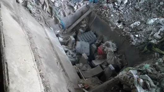 圖片說明:“漏斗”旁,抓斗車正在把大塊垃圾揀出來