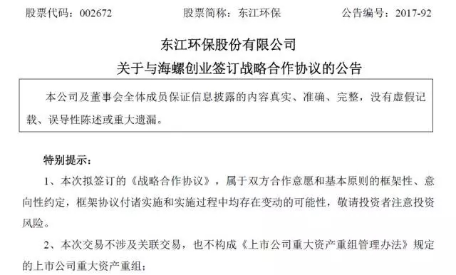 12月4日下午,東江環(huán)保發(fā)布公告稱,公司擬與中國海螺創(chuàng)業(yè)控股有限公司(下簡稱“海螺創(chuàng)業(yè)”)于2017年12月6日簽署《戰(zhàn)略合作協(xié)議》,就水泥窯協(xié)同處置固廢事宜達(dá)成戰(zhàn)略合作意向。預(yù)計(jì)雙方將在固廢處理領(lǐng)域?qū)崿F(xiàn)強(qiáng)強(qiáng)聯(lián)合、優(yōu)勢互補(bǔ),共同推進(jìn)危廢處理行業(yè)的健康發(fā)展。