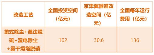 根據(jù)《陶瓷工業(yè)污染物排放標(biāo)準(zhǔn)》(GB25464-2010)修改單(征求意見(jiàn)稿)編制說(shuō)明,陶瓷生產(chǎn)企業(yè)需要投入袋式除塵、濕法脫硫、濕電除塵、噴霧干燥塔脫硝等,一條陶瓷生產(chǎn)線的大氣污染治理設(shè)施投資在600萬(wàn)元以上,每年的運(yùn)行維護(hù)費(fèi)用約400萬(wàn)元。全國(guó)的投資市場(chǎng)為204億元,假設(shè)改造的成本是新建投資的50%,京津冀的生產(chǎn)線占全國(guó)的比例約為30%,則全國(guó)的改造空間為102億元,京津冀改造市場(chǎng)為30.6億元,如果陶瓷生產(chǎn)線全面運(yùn)行,每年費(fèi)用將達(dá)到136億元。