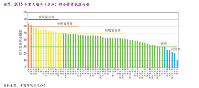 湖泊是重要的地表水資源,與人類的生活息息相關,富營養(yǎng)化不可忽視。2015年,開展營養(yǎng)狀態(tài)監(jiān)測的61個湖泊(水庫)中,貧營養(yǎng)的6個;中營養(yǎng)的41個,輕度富營養(yǎng)的12個,中度富營養(yǎng)的2個。