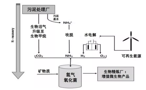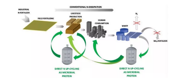 2015年5月,IWA厭氧專家組成員、比利時根特大學(xué)的Willy Verstraete教授和他的學(xué)生Silvio Matassa在期刊《環(huán)境科學(xué)與工程(ES&T)》發(fā)表了題為“Can direct conversion of used nitrogen to new feed andprotein help feed the world?”的文章,提出了一種新的轉(zhuǎn)化路徑——能量到蛋白質(zhì)(power-to-protein)。其本質(zhì)是直接將污水中的氨氮轉(zhuǎn)化成微生物蛋白質(zhì),跳過氮?dú)廪D(zhuǎn)化這一步,形成一個抄近路的氮循環(huán)的升級模式。這是一種可持續(xù)的蛋白質(zhì)生產(chǎn)方式,它比傳統(tǒng)經(jīng)典方法耗能更少,并且將“廢物”轉(zhuǎn)化為高附加值的產(chǎn)品。