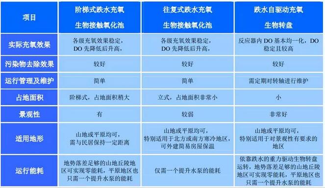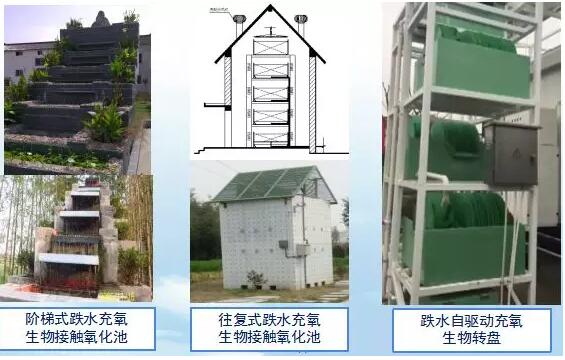 好氧單元包含多種跌水曝氣充氧裝置、脈沖多層復(fù)合濾料生物濾池、自驅(qū)動生物轉(zhuǎn)盤等。工藝通過跌水、拔風(fēng)、自然通風(fēng)等自然充氧形式,取代傳統(tǒng)大型污水處理廠高能耗的機(jī)械、鼓風(fēng)曝氣技術(shù),有效減低能耗,且具有景觀效應(yīng)。