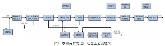 泰和污水處理廠出水水質(zhì)執(zhí)行《城鎮(zhèn)污水處理廠污染物排放標(biāo)準(zhǔn)》(GB 18918—2002)的一級(jí)A標(biāo)準(zhǔn),其中氨氮、總磷達(dá)到《地表水環(huán)境質(zhì)量標(biāo)準(zhǔn)》(GB 3838—2002)的Ⅳ類標(biāo)準(zhǔn),尾水排入蕰藻浜;污泥處理至含水率小于等于40%后外運(yùn)至石洞口污水廠集中處理處置;臭氣處理執(zhí)行上海市地方標(biāo)準(zhǔn)《城鎮(zhèn)污水處理廠大氣污染物排放標(biāo)準(zhǔn)》(DB 31/982—2016)中排氣筒及廠界排放限值。