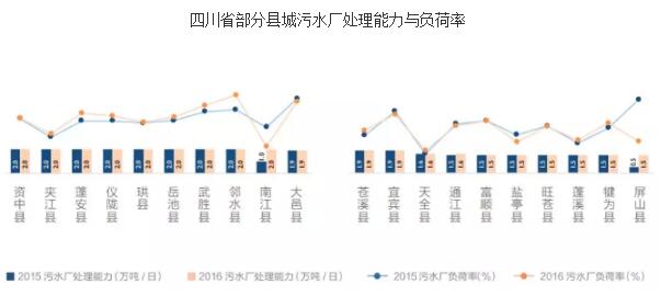 具體而言,2016 年四川76%城市污水處理率高于省平均值(84.4%)。其中什邡、康定、達(dá)州、江油等市污水處理率較低,而負(fù)荷率分別130.3%、93.4%、92.9%、90.6%。而四川省縣城大多數(shù)污水廠負(fù)荷率相對(duì)較高,特別是大邑縣、羅江縣、金堂縣、丹棱縣負(fù)荷率分別為119.7%、115.1%、113.4%、102.5%,出現(xiàn)滿負(fù)荷或超負(fù)荷運(yùn)轉(zhuǎn),但污水處理率又均低于縣城的平均水平(75.7%),新增需求較大。