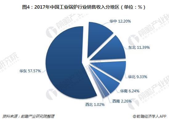不同的地區(qū)對工業(yè)鍋爐的用途大多不一樣,比如東北地區(qū),工業(yè)鍋爐多用于生產(chǎn)冬季采暖,而南方區(qū)域則主要應(yīng)用于工業(yè)生產(chǎn)動力的供應(yīng)。整體而言,我國工業(yè)鍋爐行業(yè)在華東市場發(fā)展較好,占據(jù)著過半的市場份額。2017年,華東區(qū)域銷售收入占全國銷售收入的比重為57.57%;其次是華中地區(qū),占比為12.20%;東北和華北占比分別為11.39%、9.33%;華南、西南以及西北占比分別為6.24%、2.26%、1.02%。