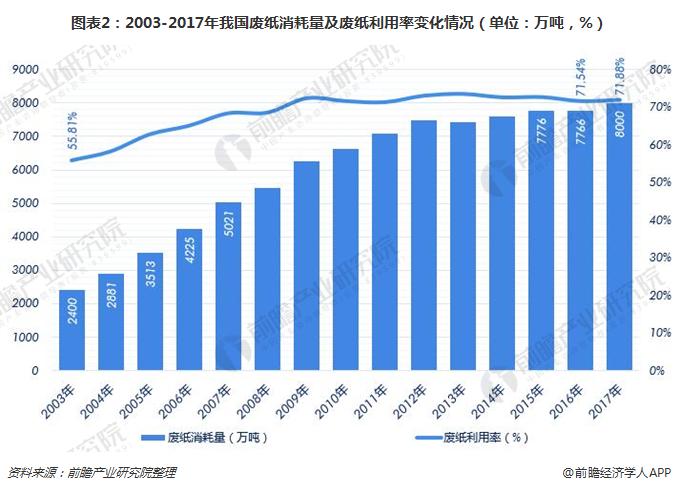 前瞻產(chǎn)業(yè)研究院長期監(jiān)測數(shù)據(jù)顯示,廢紙漿是我國最大的造紙生產(chǎn)原料,2017年廢紙漿消費量占比達到了62.7%。近年來我國廢紙消耗量逐年上升,從2003年的2400萬噸上升至2017年的8000萬噸左右,廢紙的利用率也從2003年的55.81%進一步提升至71.88%。