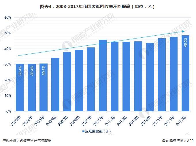 根據(jù)前瞻產(chǎn)業(yè)研究院的長期監(jiān)測,2003年以來我國廢紙回收量不斷上升,從1462萬噸上升到了2017年的5285萬噸,雖然近年來回收量增速有所放緩,2017年為6.49%,但廢紙回收量較之2010年之前已得到長足發(fā)展。
