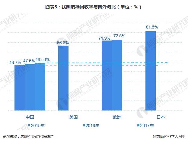 我國的廢紙回收率也從2003年的30.4%提升至了2017年的48.5%,上升了18.1個百分點。雖然我國廢紙回收率不斷提高,但與發(fā)達國家仍存在較大差距。據(jù)統(tǒng)計,目前發(fā)達國家的廢紙回收率高達80%,甚至有些國家可以達到100%。國內廢紙回收率與國外廢紙回收的差距,也正是造成我國廢紙長期依賴進口的主要原因之一。