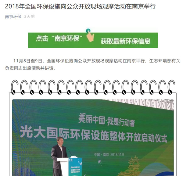 2017年7月,根據(jù)環(huán)保部、住建部《關(guān)于推進(jìn)環(huán)保設(shè)施和城市污水垃圾處理設(shè)施向公眾開放的指導(dǎo)意見》精神,江蘇省環(huán)保廳聯(lián)合省住建廳啟動(dòng)環(huán)保設(shè)施向公眾開放工作,5家單位成為第一批全國環(huán)保設(shè)施向公眾開放點(diǎn),分別是:江蘇省環(huán)境監(jiān)測(cè)中心、江蘇省南京環(huán)境監(jiān)測(cè)中心、南京鐵北污水處理廠、光大環(huán)保能源(南京)有限公司、南京凱燕電子有限公司;2018年11月,江蘇省生態(tài)環(huán)境廳和省住建廳又公布了全省40個(gè)開放點(diǎn)名單,實(shí)現(xiàn)全省13個(gè)設(shè)區(qū)市全覆蓋。