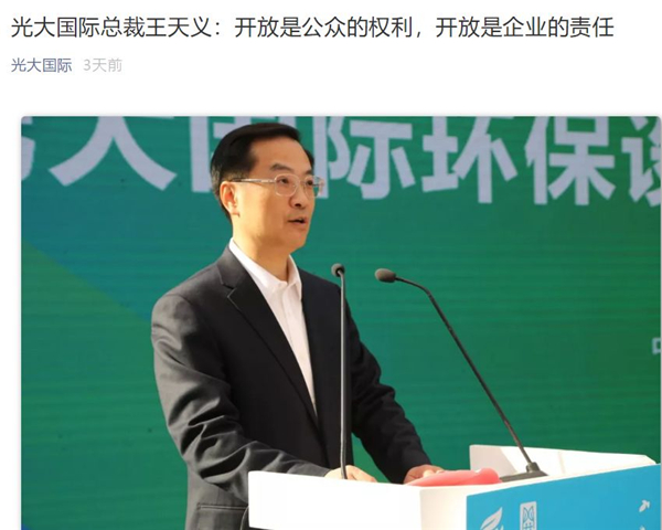 企業(yè)是污染治理的責(zé)任主體,達(dá)標(biāo)排放,既是法律的基本要求,也是企業(yè)履行環(huán)境責(zé)任不可逾越的底線。向公眾開放環(huán)保設(shè)施,讓污染治理設(shè)施在群眾監(jiān)督之下運(yùn)行,將有助于企業(yè)進(jìn)一步增強(qiáng)內(nèi)在治污動(dòng)力,不斷提升環(huán)境管理水平。開放是企業(yè)自律與他律的良性互動(dòng)。今天,光大國際正式宣布以「一個(gè)企業(yè)整體」的名義,率先向社會(huì)開放公司旗下垃圾發(fā)電、污水處理、危廢處置、生物質(zhì)發(fā)電等業(yè)務(wù)領(lǐng)域77個(gè)環(huán)保設(shè)施,自愿主動(dòng)接受公眾和社會(huì)監(jiān)督。