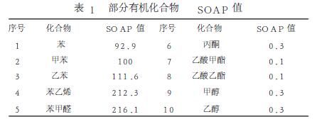揮發(fā)性有機(jī)化合物(VolatileOrganicCompounds,簡(jiǎn)稱(chēng)VOCs)一般指沸點(diǎn)低于250℃的化學(xué)物質(zhì),是最為常見(jiàn)的大氣污染物,其主要來(lái)源于化工、制藥、石油、皮革、噴涂等行業(yè)排放的有機(jī)溶劑廢氣,包含脂肪烴、鹵代烴、硫烴、芳香烴、有機(jī)酸等。這些有機(jī)廢氣不但對(duì)環(huán)境質(zhì)量、人體健康、動(dòng)植物生產(chǎn)等造成極大的直接危害,且在光氧化反應(yīng)下,易形成二次有機(jī)物氣溶膠(SecondaryOrganicAerosol,簡(jiǎn)稱(chēng)SOA),導(dǎo)致光化學(xué)煙霧、酸雨、霾和氣候變化等一系列環(huán)境問(wèn)題的產(chǎn)生,這些揮發(fā)性有機(jī)廢氣在空氣中懸浮匯聚亦是導(dǎo)致PM2.5和PM10數(shù)值不斷上升的原因之一,因而如何削減這些揮發(fā)性污染物至關(guān)重要。Derwent等[1]一直致力于二次SOA的研究,他們通過(guò)二次有機(jī)氣溶膠生成潛勢(shì)(Seconda-ryOrganicAerosolPotential,簡(jiǎn)稱(chēng)SOAP)研究,對(duì)多達(dá)上百種揮發(fā)性有機(jī)化合物進(jìn)行SOAP計(jì)算,具體見(jiàn)表1。
