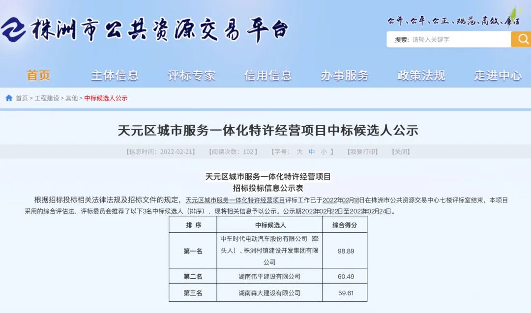 2月21日,株洲市公共資源交易平臺(tái)發(fā)布天元區(qū)城市服務(wù)一體化特許經(jīng)營(yíng)項(xiàng)目的中標(biāo)候選人公示。中車(chē)時(shí)代電動(dòng)汽車(chē)股份有限公司(牽頭人)、株洲村鎮(zhèn)建設(shè)開(kāi)發(fā)集團(tuán)有限公司以98.89分的綜合得分奪得第一名。 來(lái)源 |環(huán)衛(wèi)科技網(wǎng)作者 | 王應(yīng)心 又一央企闖入城服市場(chǎng)! 2月21日,株洲市公共資源交易平臺(tái)發(fā)布天元區(qū)城...