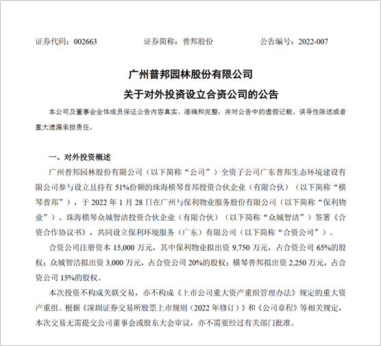 近日,保利環(huán)境(公司全稱“保利環(huán)境服務(wù)(廣東)有限公司”)注冊成立,注冊資本1.5億元,目標直指打造國內(nèi)提供環(huán)衛(wèi)行業(yè)綜合解決方案的頭部企業(yè)。股東涉及保利物業(yè)[06049]和普邦股份[002663]兩家上市公司,控股股東為保利物業(yè)。 2月7日,普邦股份發(fā)布公告,公司全資子公司廣東普邦生態(tài)環(huán)境建設(shè)有限公...