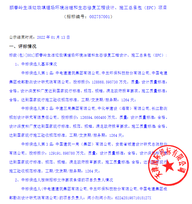 日前,中國招標(biāo)投標(biāo)公共服務(wù)平臺(tái)發(fā)布海南省顏春嶺生活垃圾填埋場環(huán)境治理和生態(tài)修復(fù)工程設(shè)計(jì)、施工總承包(EPC)項(xiàng)目中標(biāo)公示,中電建建筑集團(tuán)有限公司、中蘭環(huán)保科技股份有限公司和中國電建集團(tuán)成都勘測設(shè)計(jì)研究院有限公司組成的聯(lián)合體中標(biāo)該項(xiàng)目,中標(biāo)金額約12.9億元。 來源 | 環(huán)衛(wèi)科技網(wǎng)(ID: cnhua...