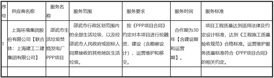 邵武市生活垃圾焚燒發(fā)電廠PPP項(xiàng)目發(fā)布中標(biāo)公告,上海環(huán)境集團(tuán)股份有限公司聯(lián)合上海建工二建集團(tuán)有限公司中標(biāo)該項(xiàng)目。 詳情如下: 一、項(xiàng)目編號(hào):FJTP-00092118015206(招標(biāo)文件編號(hào):FJTP-00092118015206)二、項(xiàng)目名稱:邵武市生活垃圾焚燒發(fā)電廠PPP項(xiàng)目三、中標(biāo)(成交)信...