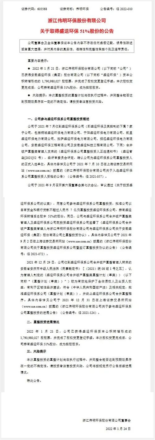 日前,偉明環(huán)保發(fā)布公告,該公司已獲得安徽盛運(yùn)環(huán)保(集團(tuán))股份有限公司(以下簡稱“盛運(yùn)環(huán)?!?資本公積轉(zhuǎn)增形成的17.91億股股票,并完成了股權(quán)變更登記手續(xù)。 2022年1月21日,浙江偉明環(huán)保股份有限公司獲得安徽盛運(yùn)環(huán)保(集團(tuán))股份有限公司(以下簡稱“盛運(yùn)環(huán)保”)資本公積轉(zhuǎn)增形成的逾17.9億股股票...