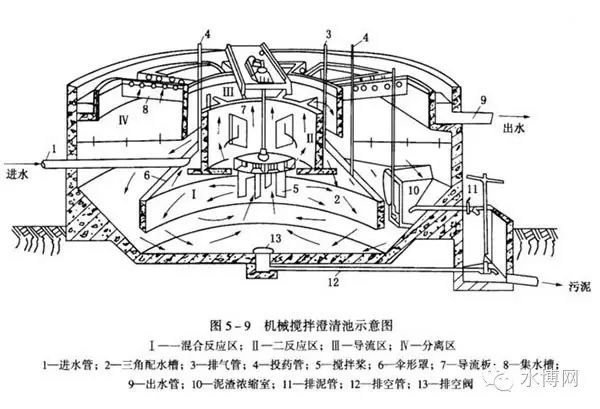 什么是?其基本原理是什么?機(jī)械攪拌澄清池將混合、絮凝反應(yīng)及沉淀工藝綜合在一起,組成示意見圖5—9。池中心有一個轉(zhuǎn)動葉輪,將原水和加人藥劑及澄清區(qū)沉降下來的回流污泥混合,促進(jìn)形成較大絮體。量是進(jìn)水量的3~5倍,為保持池內(nèi)懸浮物濃度穩(wěn)定,要及時排出多余的污泥。從進(jìn)水管進(jìn)入環(huán)形配水三角槽,混凝劑通過投藥管...